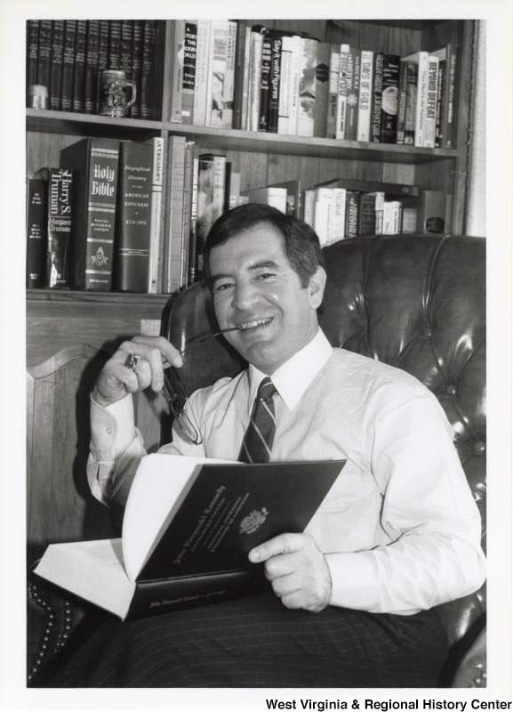 - Representative Nick J. Rahall (D-W.Va.) in an office holding a book about John Fitzgerald Kennedy.