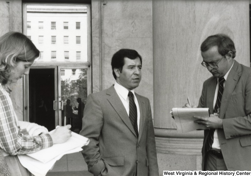 - Congressman Nick Rahall II (center) speaking to an unidentified man and woman who are taking notes.