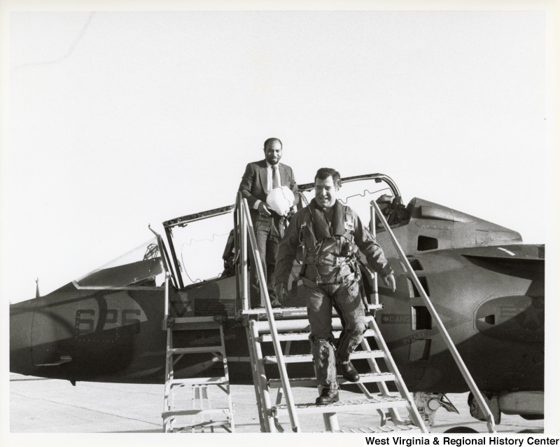 - Photograph of Congressman Rahall exiting a fighter plane
