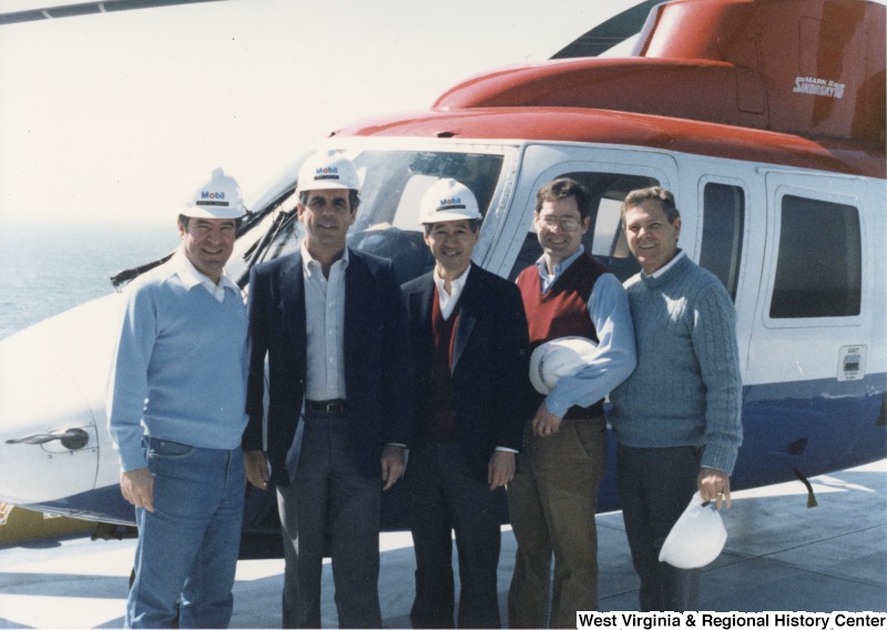 - L-R: Representative Nick J. Rahall (D-W.Va.), Representative Tony Coelho (D-Calif.), Representative Bob Matsui (D-Calif.), Representative Alan Mollohan (D-W.Va.), Representative Ronnie Flippo (D-Ala.).The Congressmen wear or hold Mobil Oil hardhats in front of a helicopter while visiting an oil rig in the Gulf of Mexico.