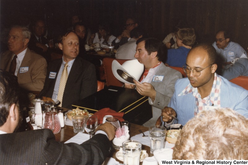 - Photograph of Congressman Rahall with a cowboy hat during a dinner at Cattlemen's Steak House in Ft. Worth