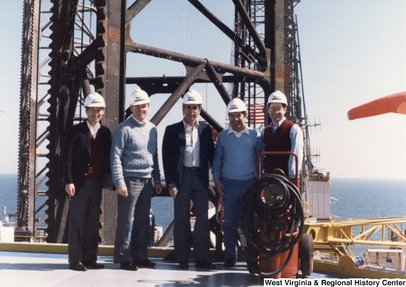 - L-R: Representative Bob Matsui (D-Calif.), Representative Ronnie Flippo (D-Ala.), Representative Tony Coelho (D-Calif.), Representative Nick J. Rahall (D-W.Va.), Representative Alan Mollohan (D-W.Va.). The Congressmen all wear Mobil Oil hard hats and stand in front of machinery while visiting an oil rig in the Gulf of Mexico.