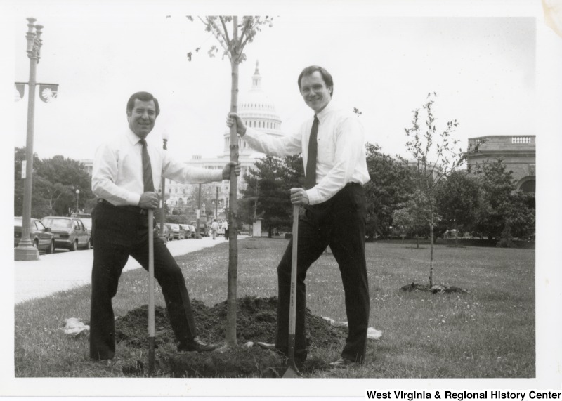 - Congressman Nick Rahall II (left) planting a tree with an unidentified man. The capitol building can be seen in the background.