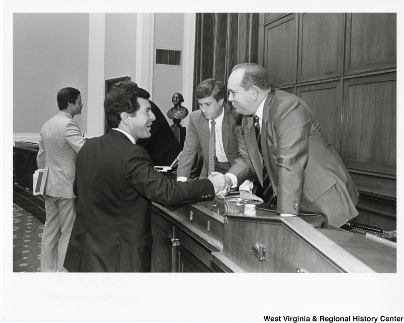 - Congressman Nick Rahall II (left) shaking the hand of an unidentified man. Two other unidentified men can be seen standing behind them.