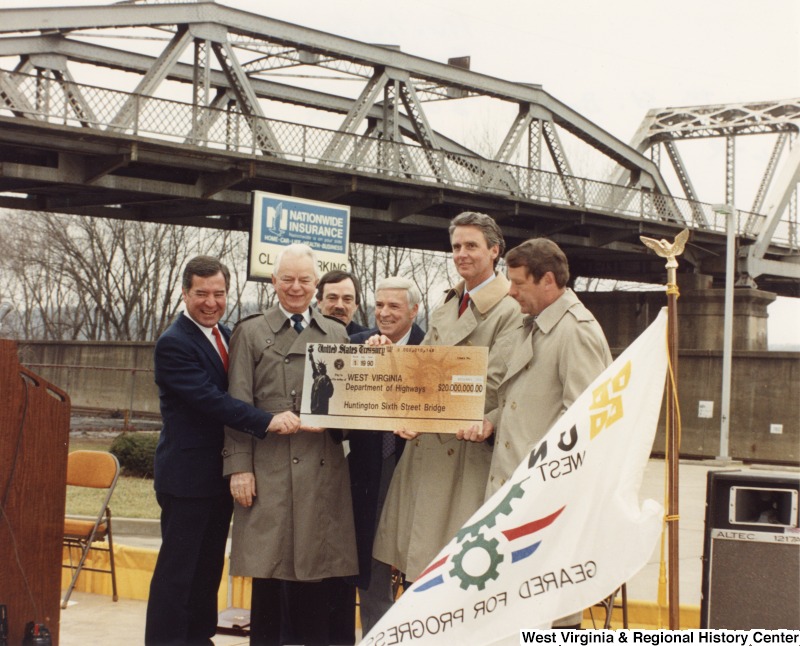 - Photograph of Congressman Rahall, Senator Byrd, Mayor Nelson, Governor Caperton, and Samuel Skinner at the 6th Street Bridge 20 million dollar check presentation