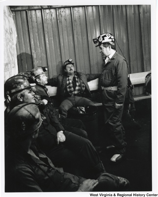 - Photograph of Congressman Rahall speaking with a group of unidentified coal miners at a mine site