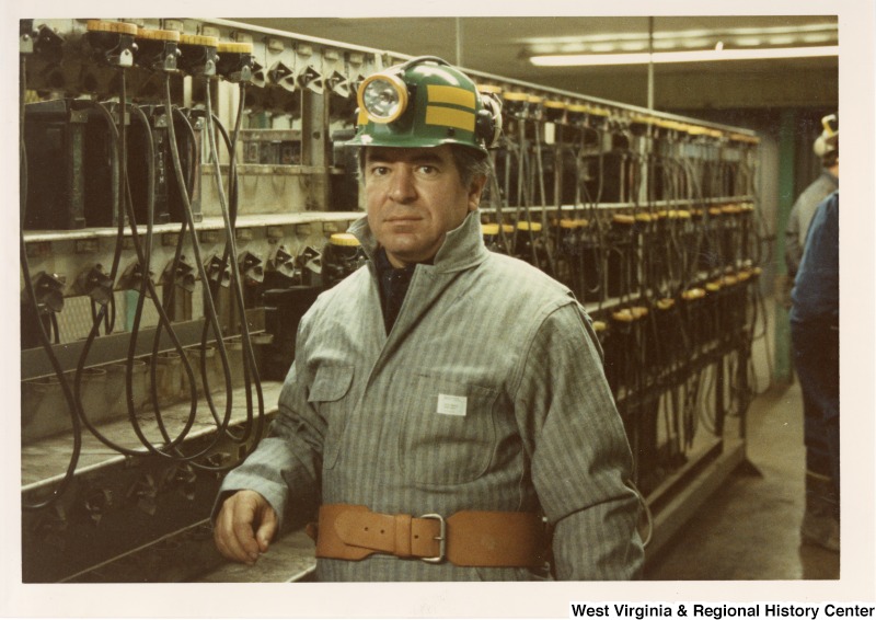 - Congressman Nick Rahall (D-WV) at a mine site wearing a coal miner uniform.