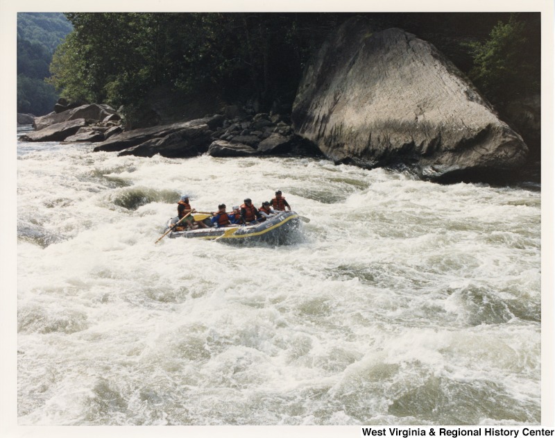 - Congressman Nick Rahall (front row far right) rafting on the New River with Manny Lujan (front row far left), United States Secretary of the Interior, and a group of unidentified people.