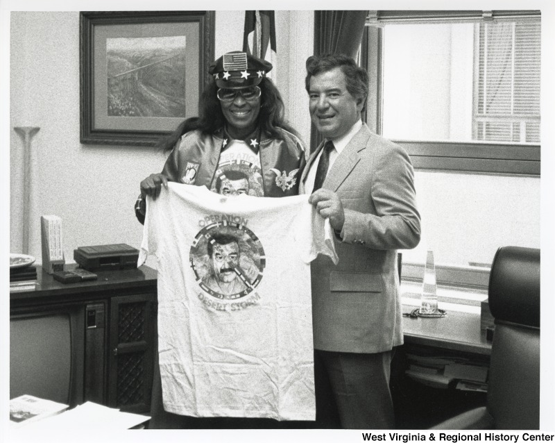 - Congressman Nick Rahall (D-WV) holding an anti-Desert Storm t-shirt with Captain Mom at his office.