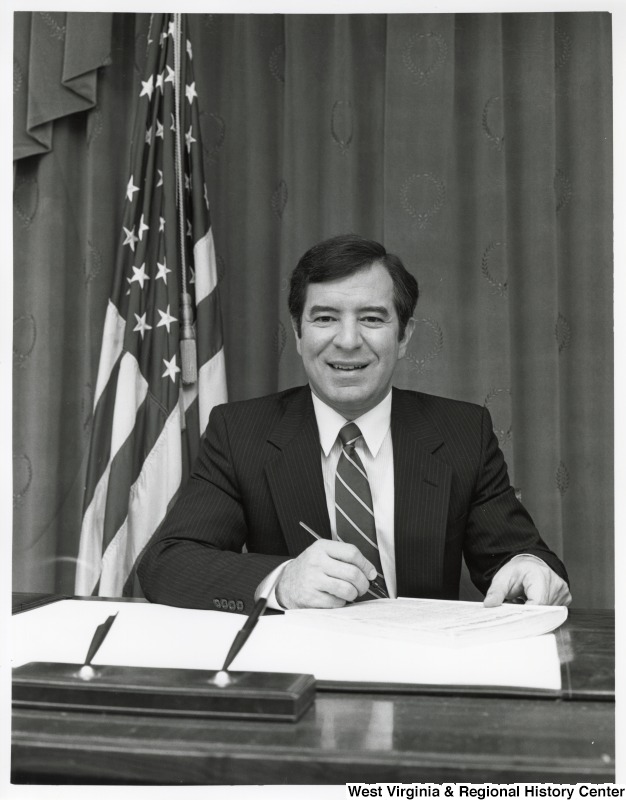 - Representative Nick J. Rahall (D-W.Va.) sits behind a desk ready to sign papers.