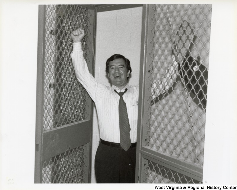 - Representative Nick J. Rahall (D-W.Va.) is pictured with his hands in the air inside a building.