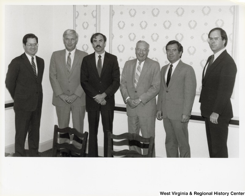 - L-R: Representative Alan Mollohan (D-W.Va.), unidentified man, Representative Bob Wise (D-W.Va.), an unidentified man, Representative Nick J. Rahall (D-W.Va.), Representative Harley O. Stagger, Jr. (D-W.Va.)The Congressmen stand in a row for a photograph.
