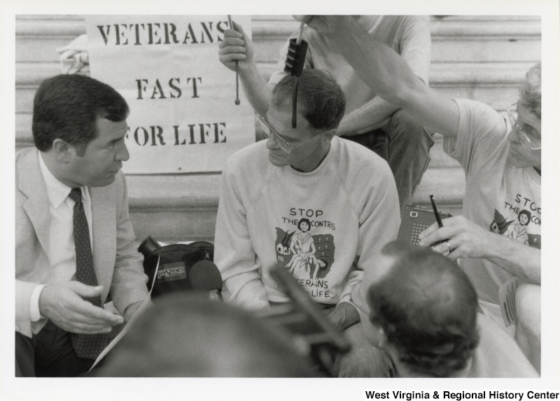 - On the left, Representative Nick J. Rahall (D-W.Va.) talks with several unidentified men on the steps of the Capitol building at the Veterans Fast for Life.