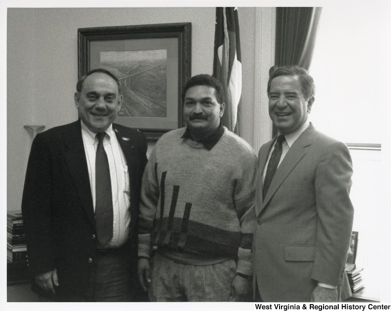 - L-R: Sam Kapourales, the President of the Columbian Miners Union, Representative Nick J. Rahall (D-W.Va.)The men stand for a photograph inside an office.