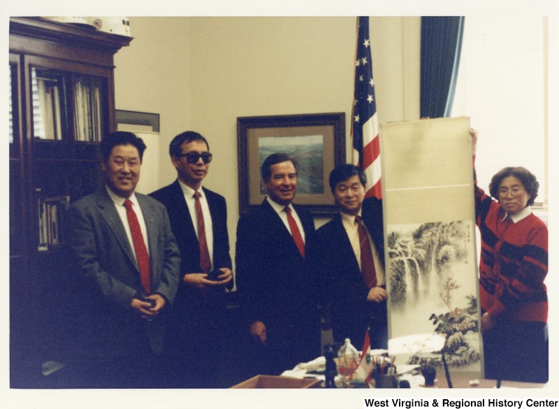 - In the center, Representative Nick J. Rahall (D-W.Va.) stands with three unidentified men and an unidentified woman of the Chinese Delegation. The woman holds a painting.