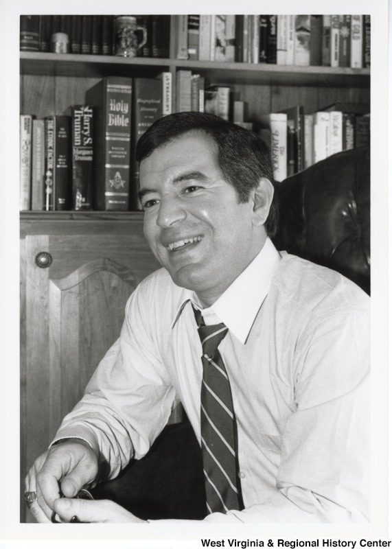 - Congressman Nick Rahall II (D-WV) smiling. He is seated with a bookshelf behind him.