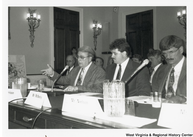 - Photograph of an unidentified man, Mr. McNeely, and Mr. Nelson at a hearing for the WV Rivers Conservation Act