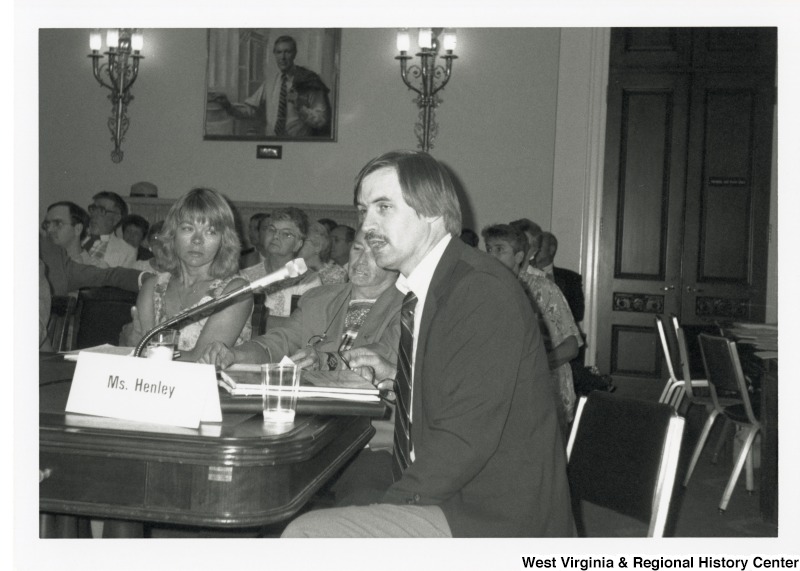 Photograph of an unidentified man speaking at a hearing for the WV Rivers Conservation Act