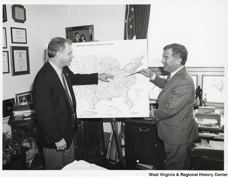 - Congressman Nick Rahall (D-WV) and former Governor and Congressman Ted Strickland (D-WV) looking at a map of the United States.