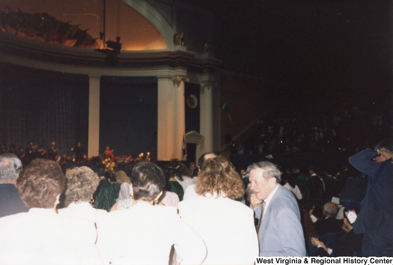 - The backs of several unidentified people are seen looking towards the stage of the commencement ceremony that Rebecca Rahall was a part of.