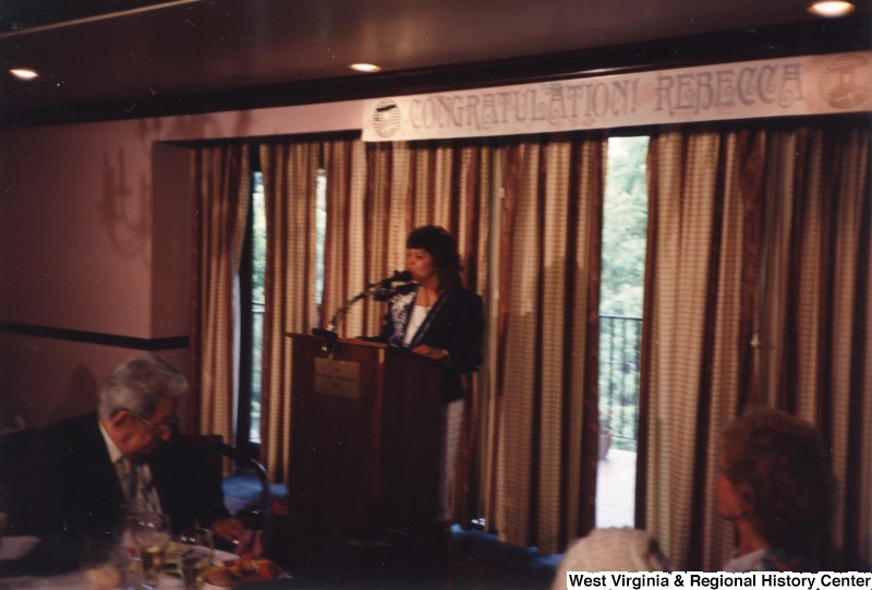 - An unidentified woman stands behind a podium and gives a speech under a banner that reads "Congratulations! Rebecca" at Rebecca Rahall's graduation party.