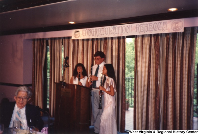 - Two unidentified young women and an unidentified young man stand around a podium under a banner that reads "Congratulations! Rebecca" and play clarinets.