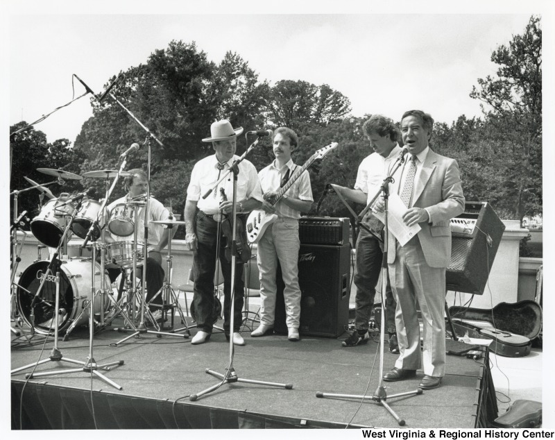 - On the right, Representative Nick J. Rahall (D-W.Va.) stands on stage with Everett Lilly & the Clear Creek Crossin' musicians.