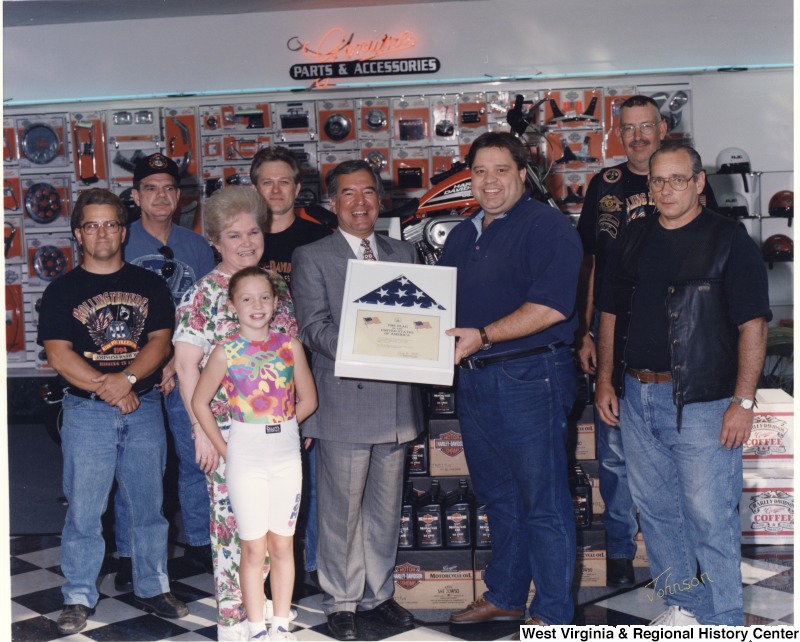 - In the middle, Representative Nick J. Rahall (D-W.Va.) stands and holds a framed American flag for a photograph with a group of eight unidentified people at Benjy's Harley Davidson shop.
