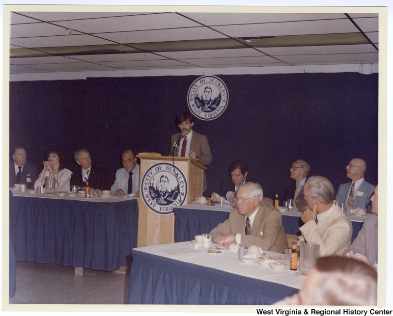 - Senators Jennings Randolph (left in back row) and Robert C. Byrd (third from left in back row) as well as Congressman Nick Rahall, II (third from right in back row) at a banquet following the groundbreaking of the Beckley Sewage Treatment plant. An unknown man is speaking.