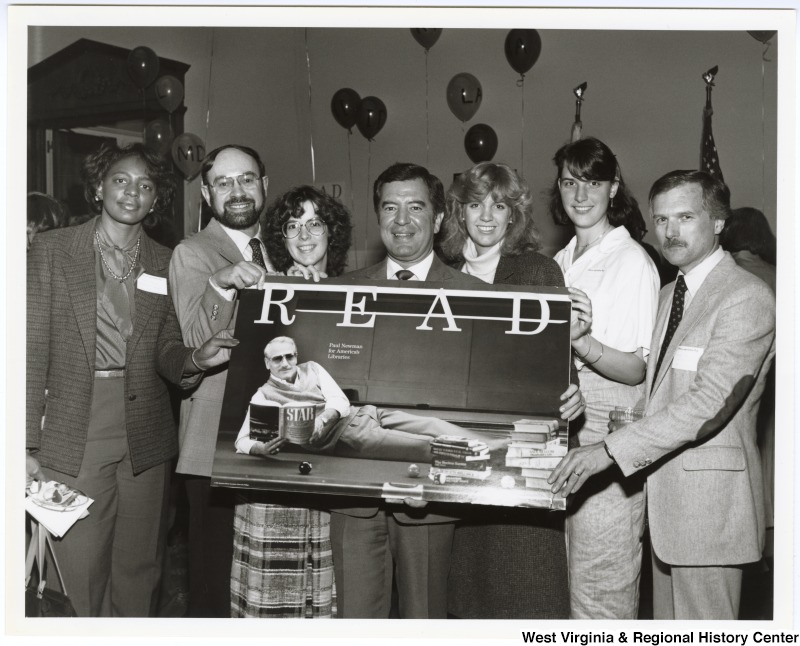 - Congressman Nick Rahall, II (center) with an unidentified group of people holding a poster of Paul Newman at the American Library Association's Legislative Day.