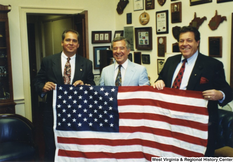 - L-R: Senator Earl Ray Tomblin (D-W.Va.), Representative Nick J. Rahall (D-W.Va.), unidentified man. These three men hold an American flag.