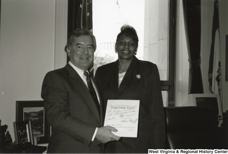 - On the left, Representative Nick J. Rahall (D.W.Va.) holds a "Congressional Record" and stands for a photograph with an unidentified woman.