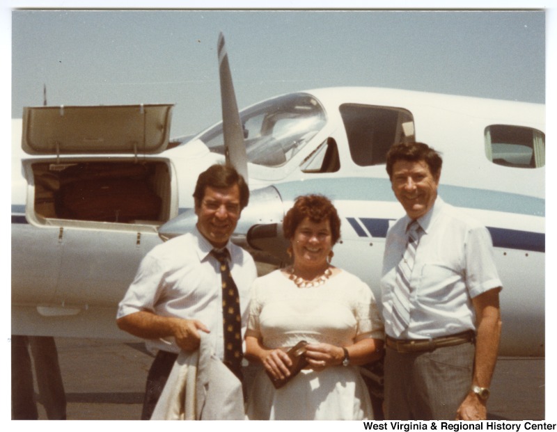- Congressman Nick Rahall, II (left) standing in front of a small airplane with an unidentified man and woman.