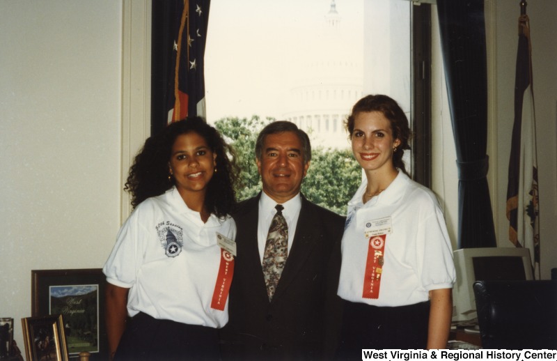 - Representative Nick J. Rahall (D-W.Va.) stands between two unidentified women wearing ribbons for a photograph.