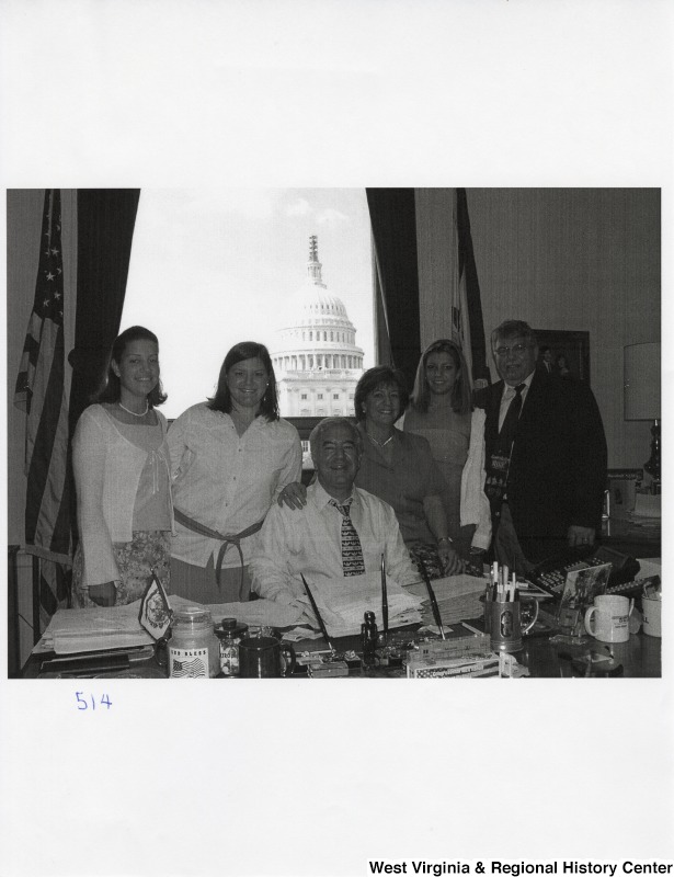 - Representative Nick J. Rahall (D-W.Va.) sits at his desk for a photograph between a group of four unidentified women and an unidentified man.