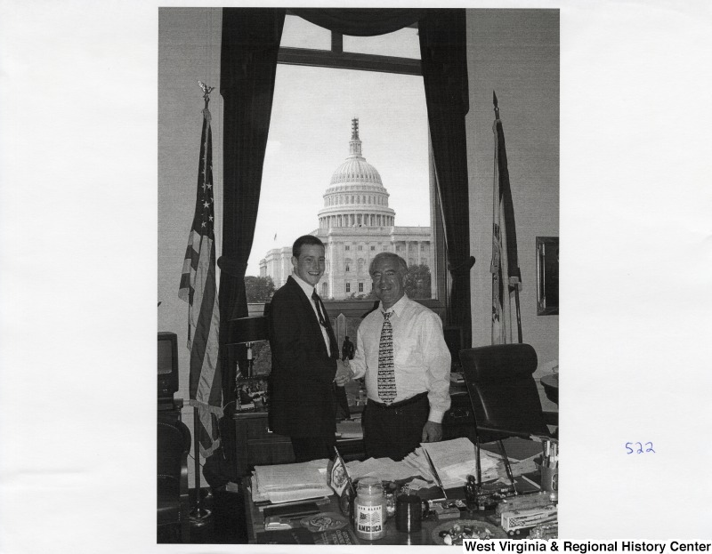 - On the right, Representative Nick J. Rahall (D-W.Va.) shakes hands with an unidentified man in his office.