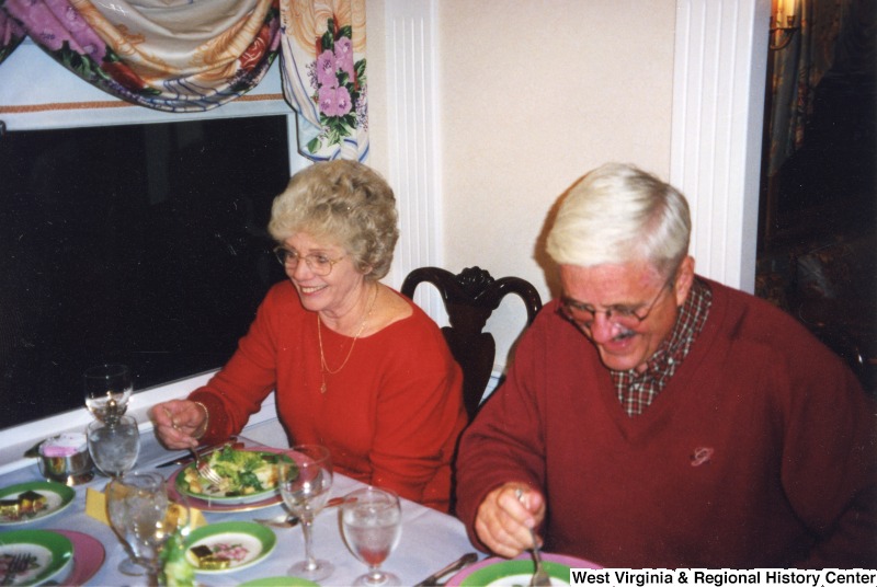 Photograph of two unidentified senior citizens eating dinner on a CSX train