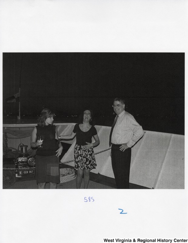 - Two unidentified women and an unidentified man laugh on the bow of a boat at a party.