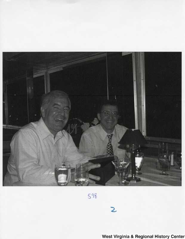 - On the right, Representative Nick J. Rahall (D-W.Va.) sits with an unidentified man at a table during a party.