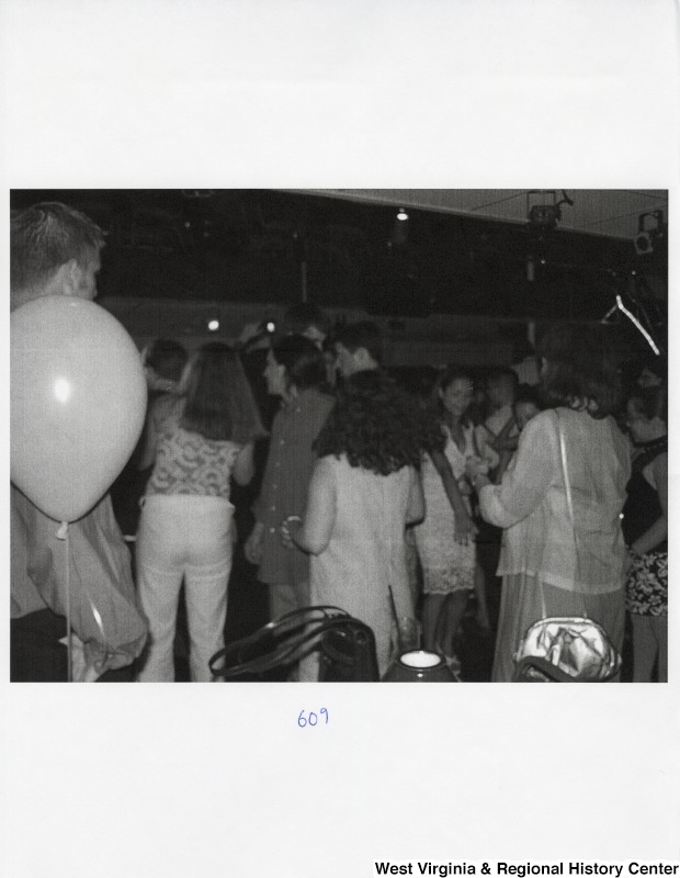 - A large group of unidentified people dance together on a dance floor at a party with balloons.