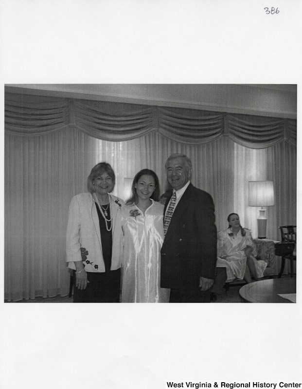 - L-R: unidentified woman, Suzanne Rahall, Representative Nick J. Rahall (D-W.Va.) The three stand for a photograph while Suzanne wears a graduation gown.