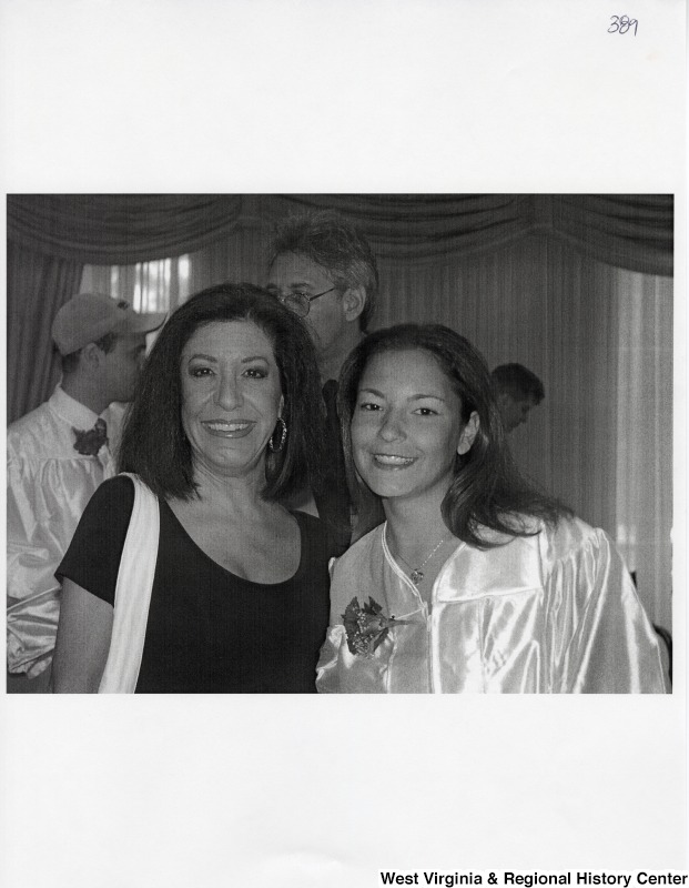 - On the right, Suzanne Rahall, wearing a graduation gown, smiles for a photograph with an unidentified woman.