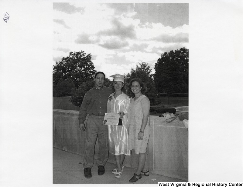 - L-R: unidentified young man, Suzanne Rahall, Rebecca RahallThe three stand outside for a photograph while Suzanne wears her graduation regalia.