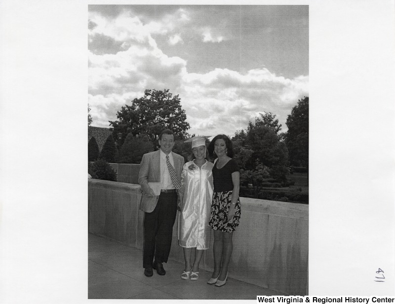 - Suzanne Rahall wears her graduation regalia as she stands between an unidentified man and woman outside for a photograph.