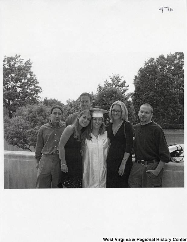 - Suzanne Rahall, wearing her graduation regalia, stands in the middle of a group of five unidentified young people.