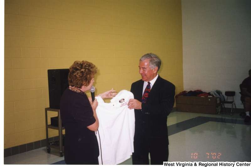 - Congressman Nick Rahall (D-WV) accepting a shirt from an an unidentified woman at Barboursville Elementary School.