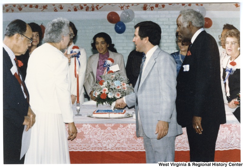- Congressman Nick Rahall, II cutting cake at McDowell County Head Start Program. He is surrounded by unidentified people.The back of the image has written on it: "Lester Toney Bx III Amonate Va. 24601"