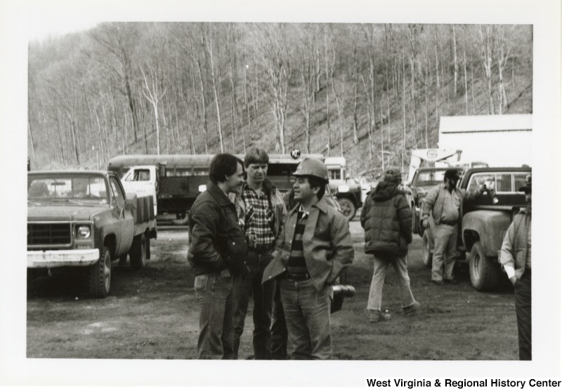 - Congressman Nick Rahall, II (third from left) speaking to two unidentified men during his visit of the Hobet Coal Mine.
