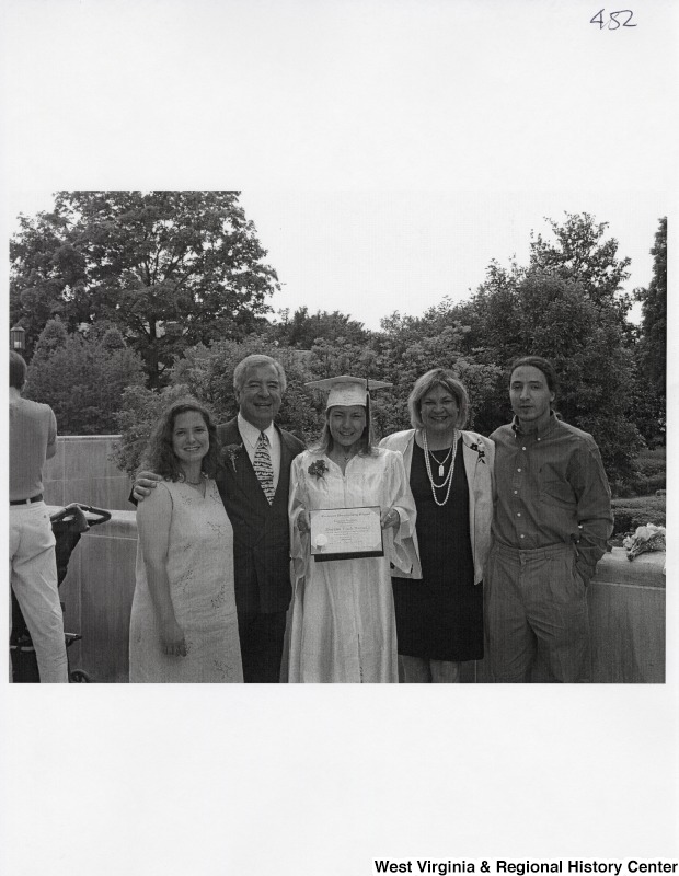 - L-R: Rebecca Rahall, Representative Nick J. Rahall (D-W.Va.), Suzanne Rahall, unidentified woman, unidentified manThe five stand for a photograph while Suzanne holds her diploma.