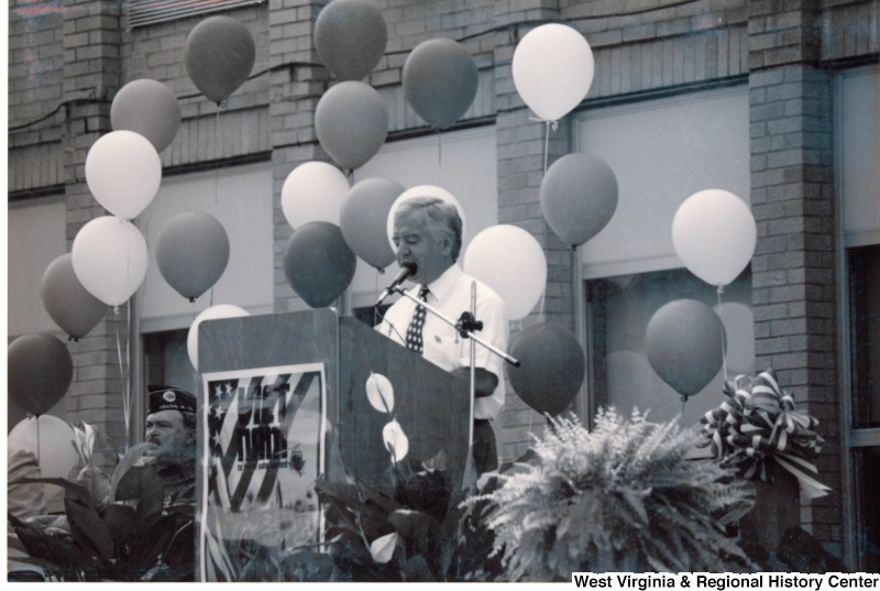 - Photograph of Congressman Rahall speaking at Fort Gay High School